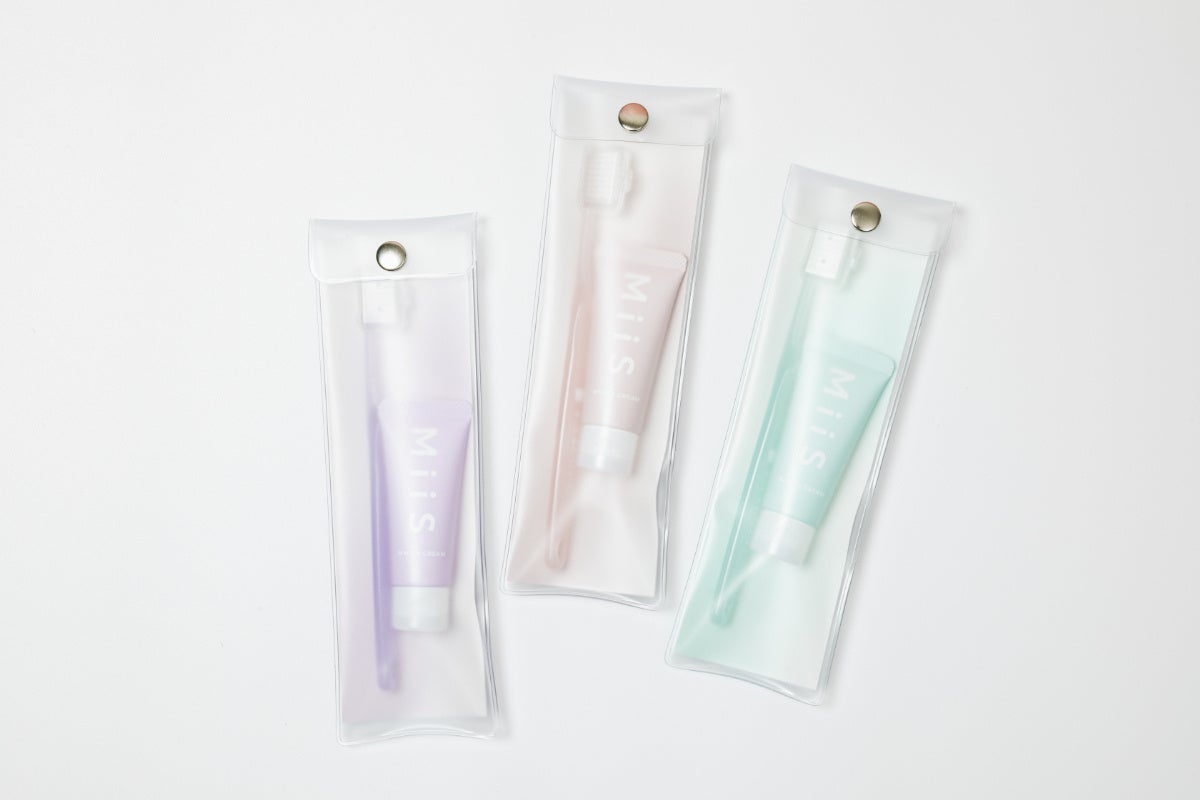 持ち運びに便利なミニサイズのホワイティクリームと、MiiSオリジナルのホワイトニング*2専用歯ブラシ「プラチナホワイトニング歯ブラシ」をオリジナルポーチに入れた「ホワイトニングトラベルセット」。