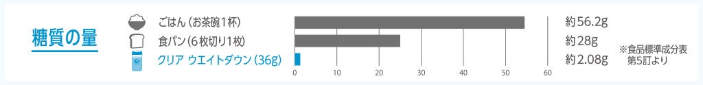 お茶碗1杯のごはんが約56g、食パン6枚切り1枚が約28gに対し、1食分約1.6gの糖質です。