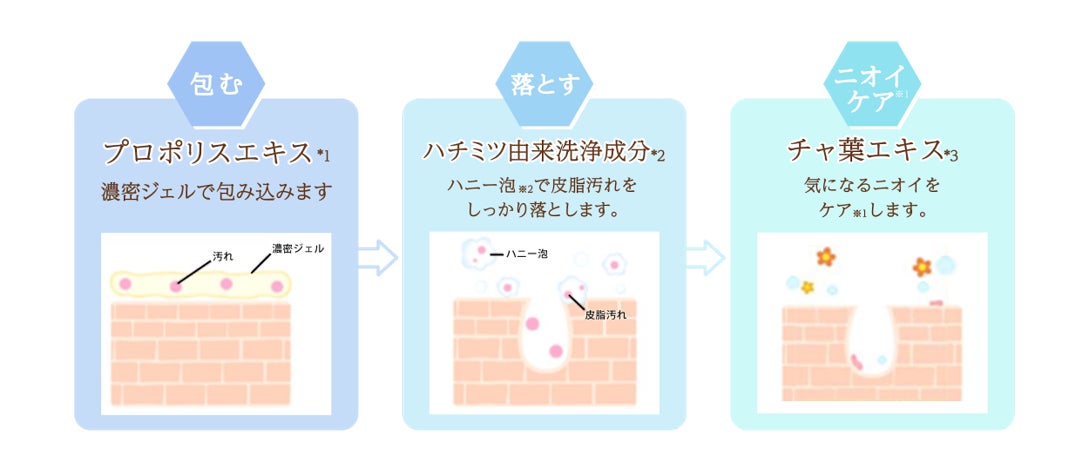 濃蜜ジェルで全身を包み込む「プロポリスエキス*1」、優しく汚れを洗い落とす「ハチミツ由来の洗浄成分*2」、そして気になるニオイをケア※1する「チャ葉エキス*3」。