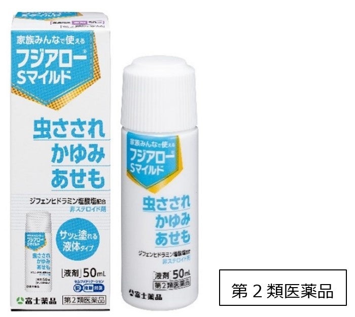 「フジアロー®Sマイルド」は、かゆみを鎮める抗ヒスタミン成分のジフェンヒドラミン塩酸塩を配合した、ステロイド成分を含まない塗り薬です。液体タイプでサッと塗れて、虫さされやあせもなどによるかゆみを鎮めます。