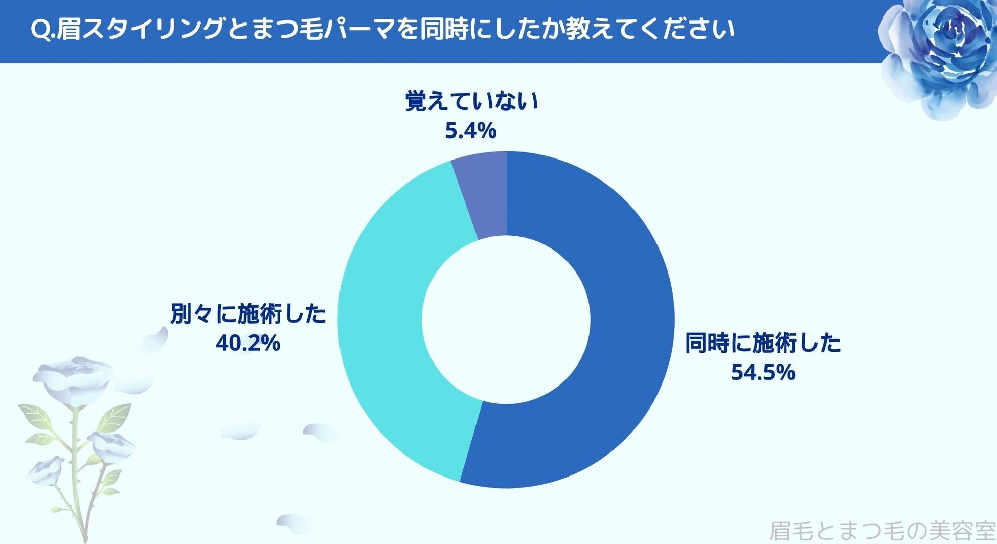 眉スタイリングとまつ毛パーマを同時に施術したかお聞きしたところ「同時に施術した(54.5%)」、「別々に施術した(40.2%)」、「覚えていない(5.4%)」という結果になりました。