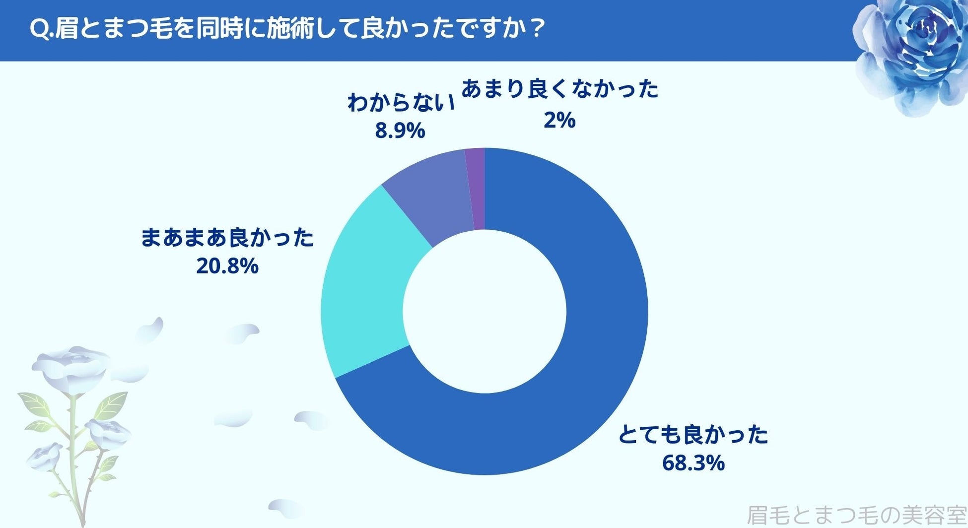 眉とまつ毛を同時に施術した感想をお聞きしたところ「とても良かった(68.3%)」、「まあまあ良かった(20.8%)」、「わからない(8.9%)」、「あまり良くなかった(2%)」という結果になりました。