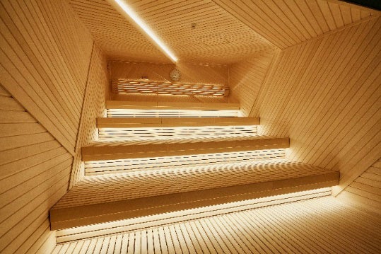 18名まで入れるゆったり座面のパブリックサウナには、大阪市福島区では初となるオートロウリュ&オートブロワーを導入(男性のお客様のみご利用いただけます)。水風呂はどっぷり浸かれる深さ110cmの浴槽に、チラー完備による安定した低水温を提供します。さらに大型シーリングファンとゆらぎのある調光で内気浴ができるととのいばをご用意しています。
