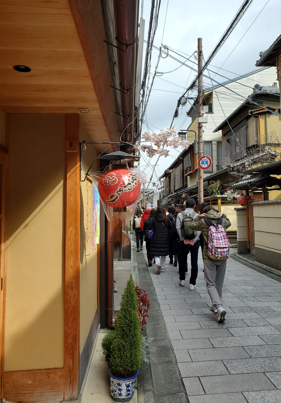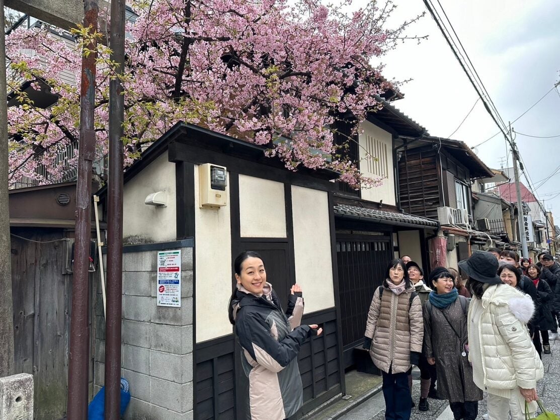 京都の風情ある街並みを抜け、「祇園さん」と呼ばれ親しまれる八坂神社に到着しました。八坂神社は祇園祭が行われることでも有名で、京都観光の中心地となっています。道中では早咲きの桜にも恵まれ、浅田真央さん・参加者の笑顔があふれました。