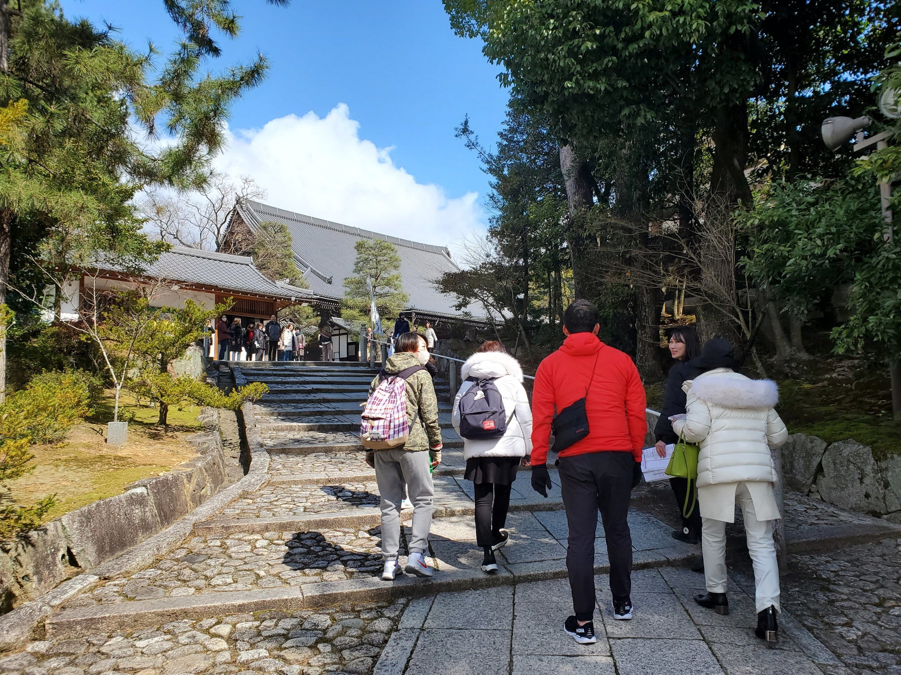 昼食を終え、国宝に指定されている御影堂がある知恩院に向かいました。南側入り口は、「男坂・女坂」という坂道があり、男坂は一段が高めの急な階段、女坂は緩やかな坂道になっています。その坂を浅田真央さんと参加者は各々どちらで進むかを選択。浅田真央さんは「どちらかを選ぶ時は迷わず困難な方を選びます!」とのことで、男坂を選択。参加者も一緒になって男坂を登っていきました。