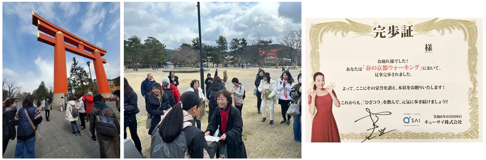 キューサイ株式会社(本社:福岡市中央区、代表取締役社長:佐伯 澄)は、「浅田真央さんと行く 春の京都ウォーキング」というイベントを3月9日(土)に実施いたしました。同企画には当社の機能性表示食品「ひざサポートコラーゲン」のイメージキャラクターを務めるフィギュアスケーターの浅田真央さんが一般応募者とともに参加し、京都の名所をめぐるウォーキングを楽しみました。