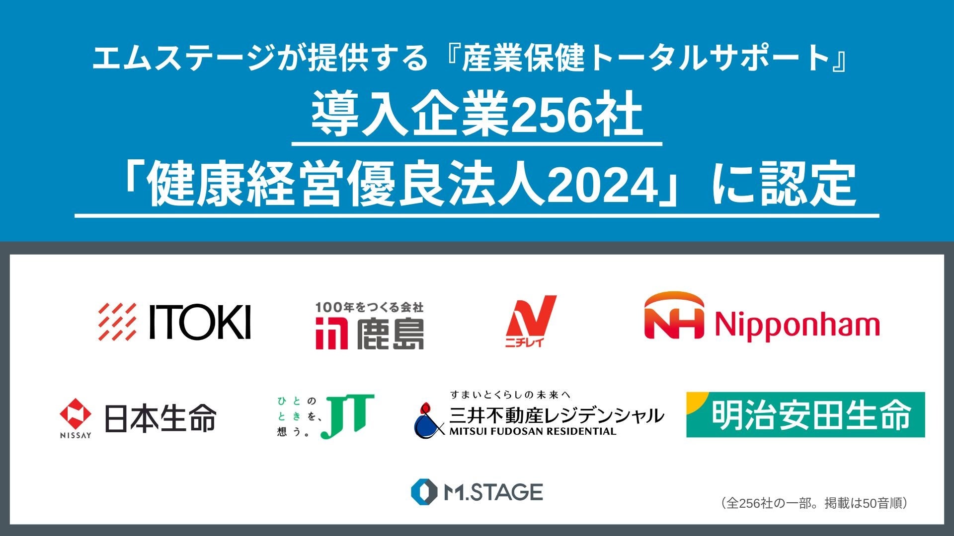 この度、エムステージが提供する『産業保健トータルサポート』ご利用企業のうち、256社が「健康経営優良法人2024」に認定されました。また、そのうち、大規模法人部門の上位法人「ホワイト500」に31社、中小規模法人部門の上位法人「ブライト500」に3社が認定され、東京証券取引所の上場会社の中から特に優れた健康経営を実践している企業として紹介される「健康経営銘柄」に1社が選定されています。