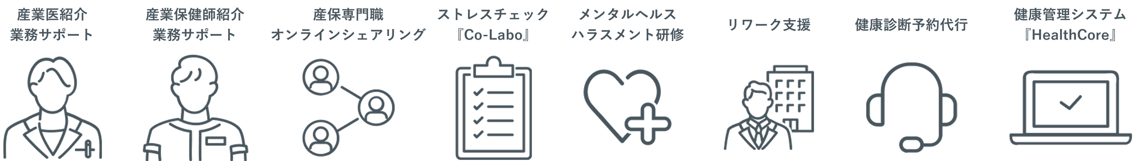 『産業保健トータルサポート』では、医師紹介業20年のノウハウとネットワークによる産業医や保健師の紹介・選任後の業務サポートをはじめ、ストレスチェック『Co-Labo』、健康診断予約代行、リワーク支援サービス等で、企業のニーズに応じて、健康経営を支援しています。