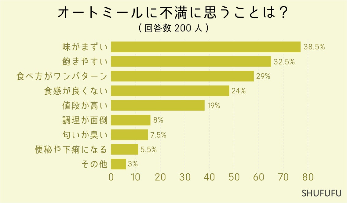オートミールに不満に思うことでは「味がまずい」が最多でした。ぼそぼそしていて、穀物の風味が強いので苦手な方が多いようです。