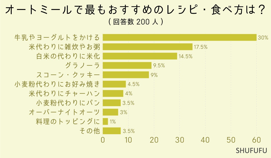 オートミールで最もおすすめのレシピ・食べ方を尋ねたところ、1位は「牛乳やヨーグルトをかける(30%)」、2位「米代わりに雑炊やお粥(17.5%)」となりました。オートミールにはタンパク質が不足しているそうなので、乳製品と一緒に摂ると良いようですね。