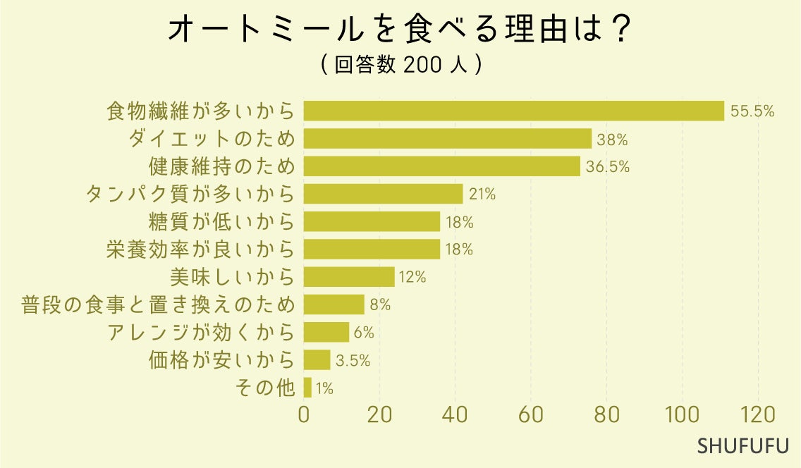 オートミールを食べる理由に関しては1位「食物繊維が多いから(55.5%)」、2位「ダイエットのため(38%)」でした。オートミールは栄養素がたっぷりな割にカロリーが低いのでダイエット中の方には最適な食べ物の一つですね。