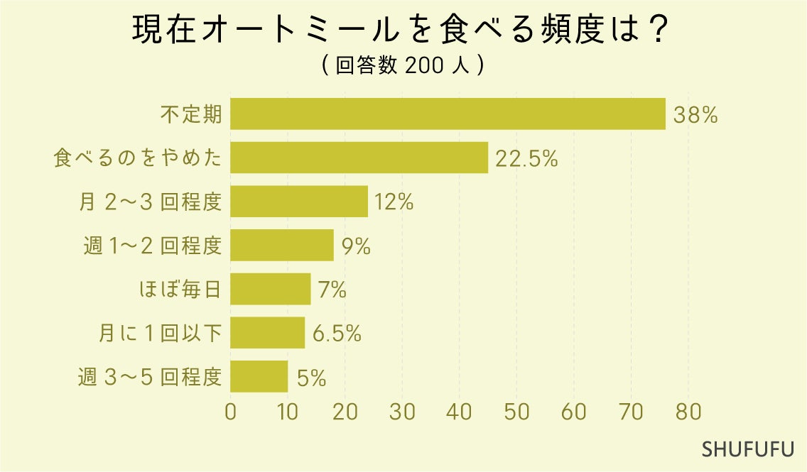 現在オートミールを食べる頻度は?の問いに対して最も多かったのが「不定期(38%)」でした。 次いで「食べるのをやめた(22.5%)」「月2〜3回程度(12%)」という結果でした。全体の半数以上の人が定期的に食べ続けることができていないようです。
