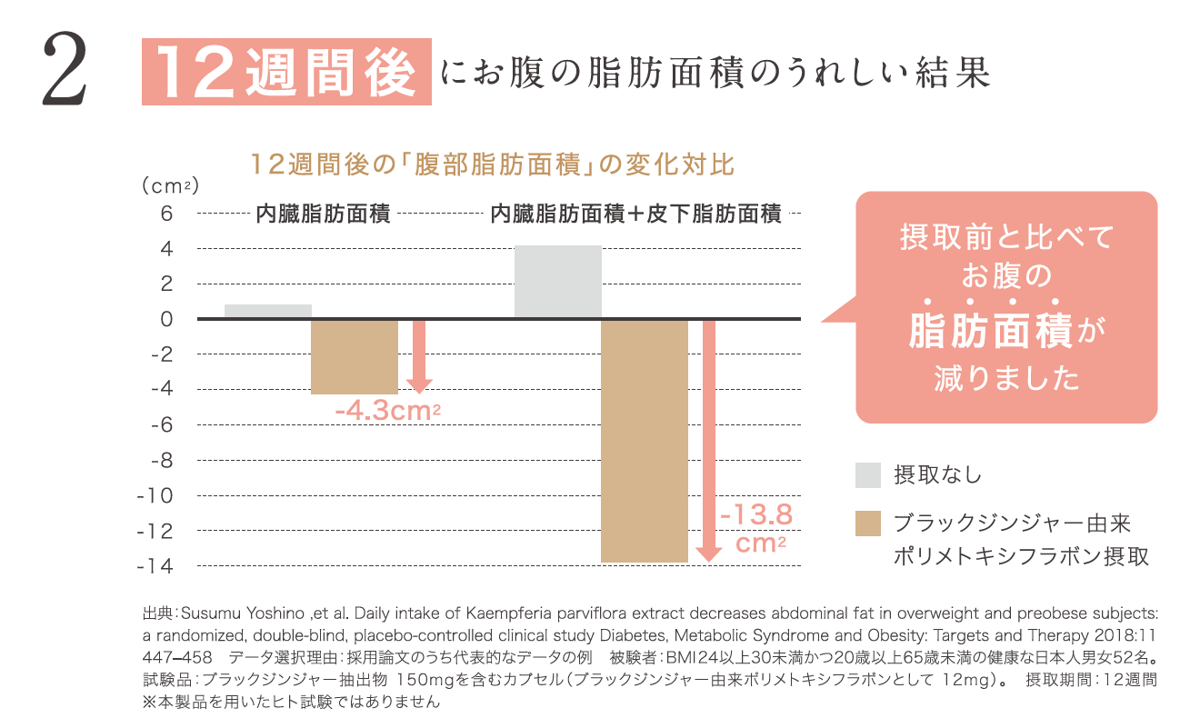• [補足データ]:ブラックジンジャー由来ポリメトキシフラボン(12mg)2つの機能性