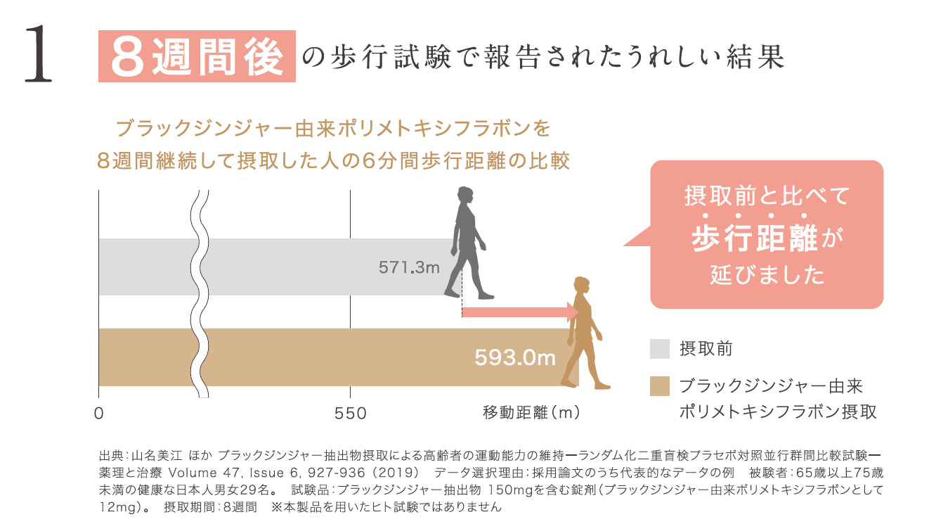 【届出表示】本品にはブラックジンジャー由来ポリメトキシフラボンが含まれます。ブラックジンジャー由来ポリメトキシフラボンは、足の曲げ伸ばし等の筋肉に軽い負荷がかかる運動との併用で、年齢とともに低下する脚の筋力に作用することにより、中高年の方の歩行能力の向上に役立つことが報告されています。また、日常活動時のエネルギー代謝において脂肪を消費しやすくする作用により、BMIが高めの方の腹部の脂肪を減らす機能があることが報告されています。