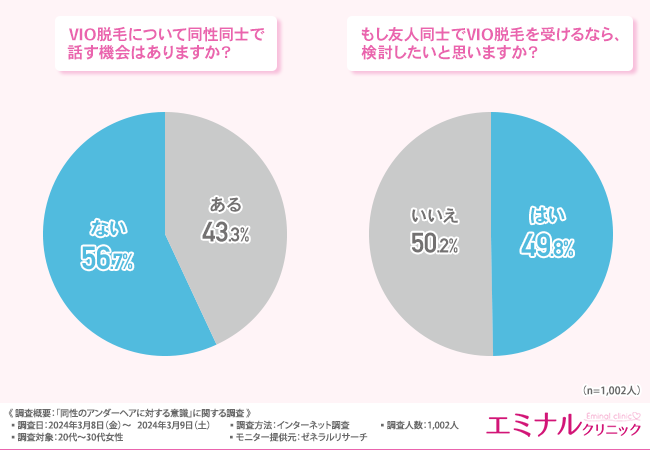 そこで今回、医療脱毛を手掛けるエミナルクリニックhttps://eminal-clinic.jp/lp01/?refmedia=11073)は、20代~30代女性を対象に「同性のアンダーヘアに対する意識」に関する調査を実施しました。