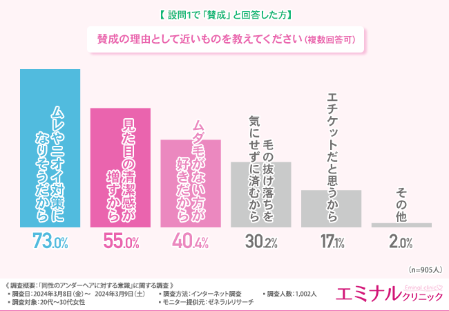 続いて、VIO脱毛に「賛成」と回答した方に「賛成の理由として近いものを教えてください(複数回答可)」と質問したところ、『ムレやニオイ対策になりそうだから(73.0%)』と回答した方が最も多く、次いで『見た目の清潔感が増すから(55.0%)』『ムダ毛がない方が好きだから(40.4%)』と続きました。