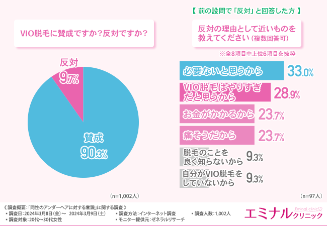はじめに、「VIO脱毛について賛成か?反対か?」と質問したところ、『賛成(90.3%)』『反対(9.7%)』という結果になりました。
