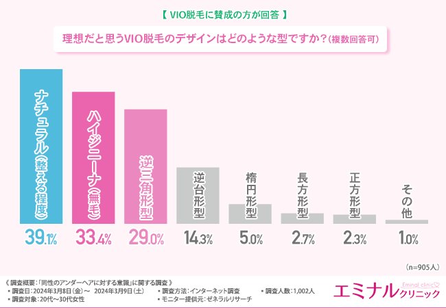「理想だと思うVIO脱毛のデザインはどのような型ですか?(複数回答可)」と質問したところ、『ナチュラル(整える程度)(39.1%)』と回答した方が最も多く、次いで『ハイジニーナ(無毛)(33.4%)』『逆三角形型(29.0%)』と続きました。
