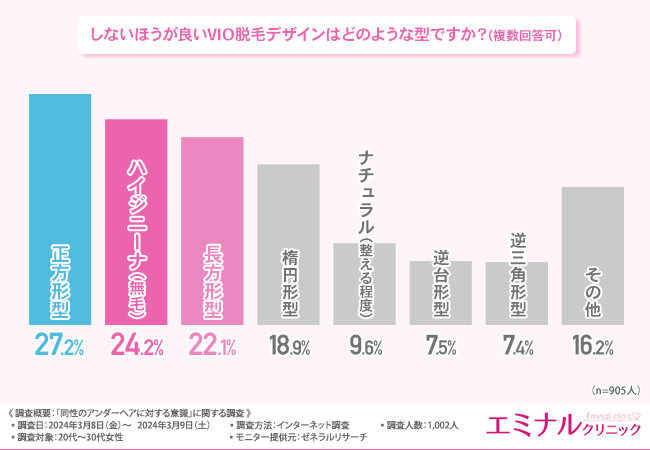 続いて、しないほうが良いVIO脱毛デザインはどのような型ですか?(複数回答可)と質問したところ、『正方形型(27.2%)』と回答した方が最も多く、次いで『ハイジニーナ(無毛)(24.2%)』『長方形型(22.1%)』と続きました。