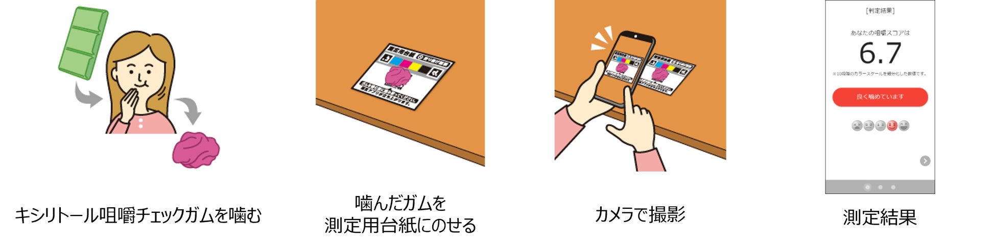 キシリトール咀嚼チェックガムは、「唾液の量」「咬み合わせの面積」「舌の力」「唇・舌・顎関節の運動機能」など複合的な因子で総合的に咀嚼能力を評価することができます。(株式会社オーラルケアから販売されています)