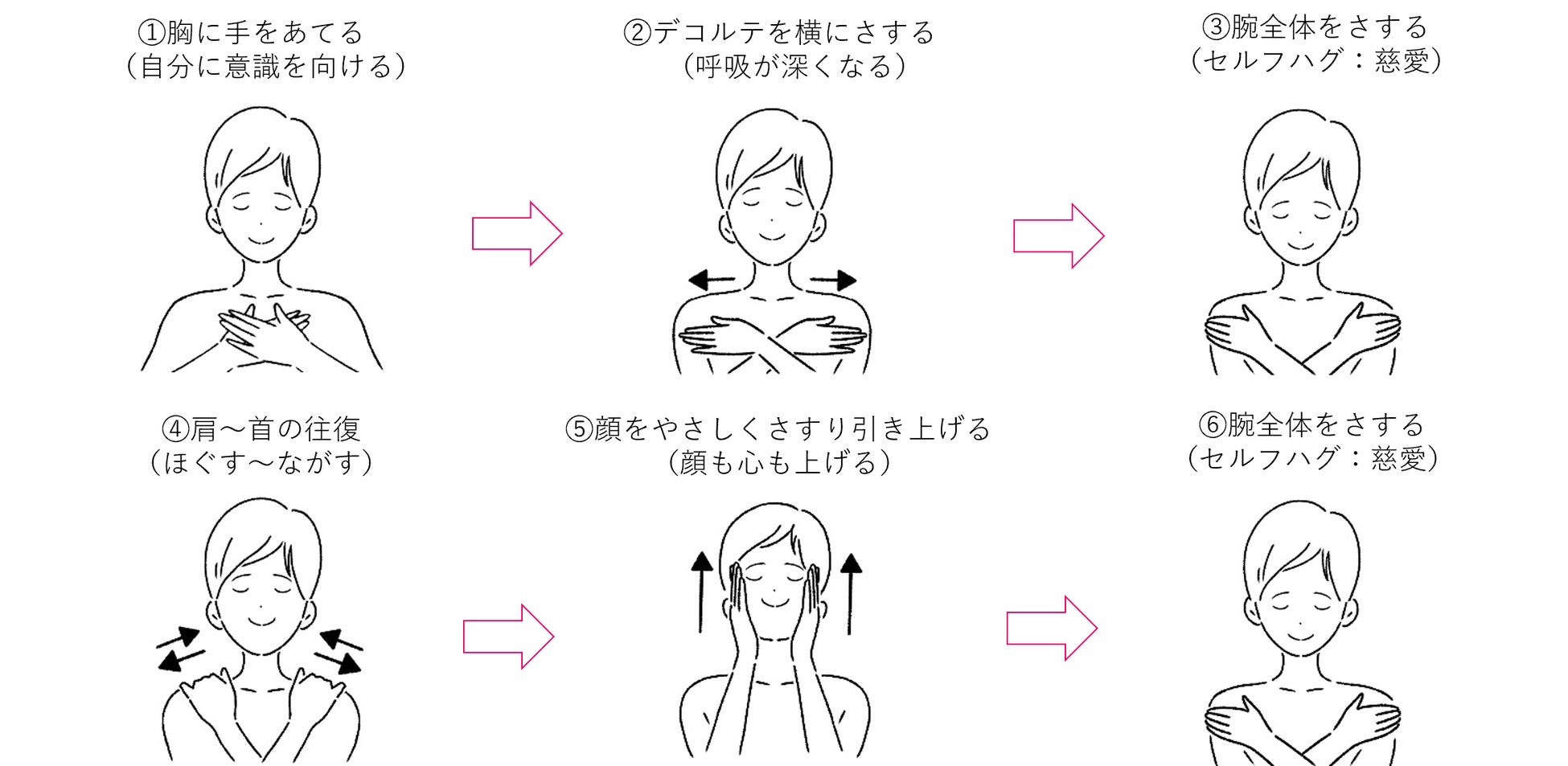 手のひらで自分の身体に触れるとオキシトシンが出ます。また、触れることで慈愛ができるので、入浴×さすることの2つに幸せの相乗効果があります。自分に触れると内側に意識が行きやすくなり、自分がクリアに見えてきます。湯船に浸かって手で身体をゆっくりとさすったり、ボディウォッシュ時も手で身体を洗うようにするとオキシトシンが出ます。セルフハグも効果的です。