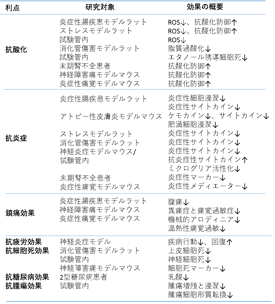 多彩な利点としては、抗酸化、抗炎症、鎮痛効果、抗疲労効果、抗細胞死効果、抗糖尿病効果、抗腫瘍効果が、研究対象と効果の概要と共に紹介されています。