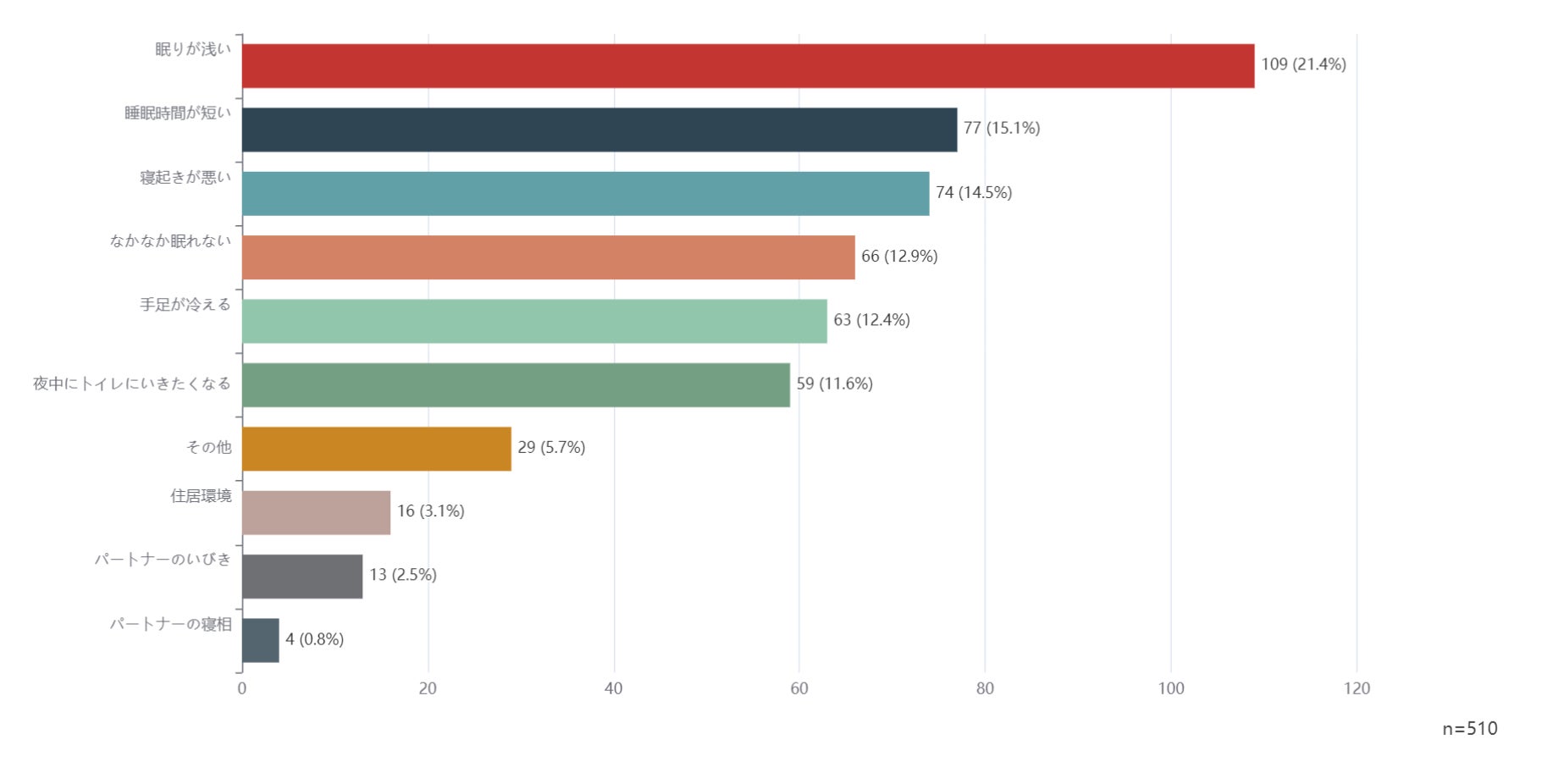 ・なぜ満足できていないかという理由では、「眠りが浅い」109人(21.4%)、「睡眠時間が短い」77人(15.1%)、「寝起きが悪い」74人(14.5%)が挙げられている。