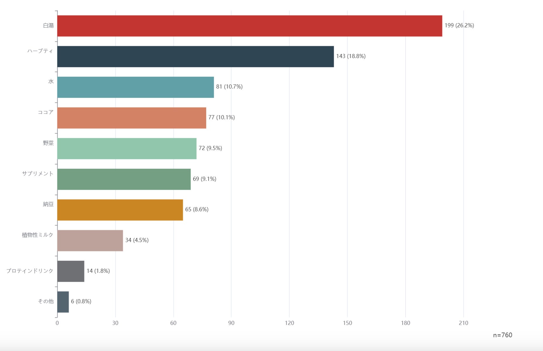 「白湯」や「ハーブティー」、「ココア」などの飲み物が上位を占め、その次に「野菜」という回答が続きました。白湯・水・ハーブティーが上位に上がっている理由として、消化に負担がかかる、脂質や糖質を気にされている方が多いのでは。との見解となります。