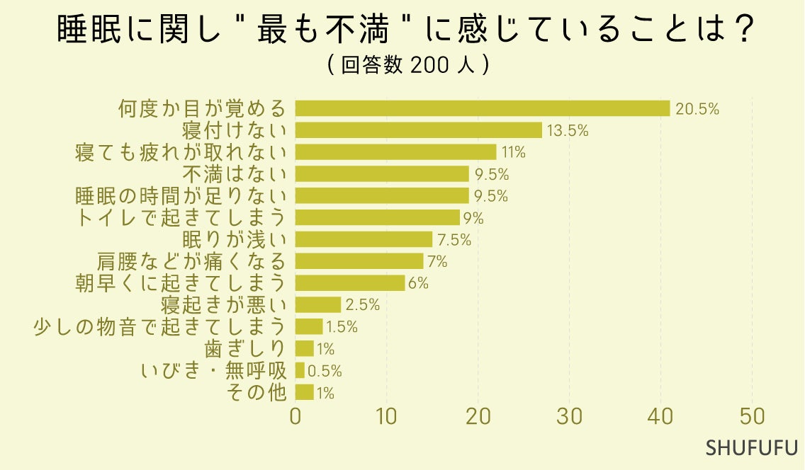睡眠に関し””最も不満””に感じていることに関しては1位「何度か目が覚める(20.5%)」、2位「寝付けない(13.5%)」でした。いずれも自分の意志に反して寝れないという状態はつらいですね。