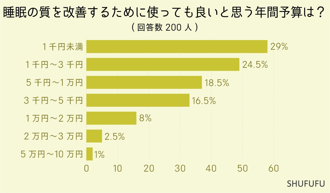 睡眠の質を改善するために使っても良いと思う年間予算では「1千円未満」が多数派でした。睡眠の質に対しては費用をかけてまで改善したいと思う人は少ないようでした。