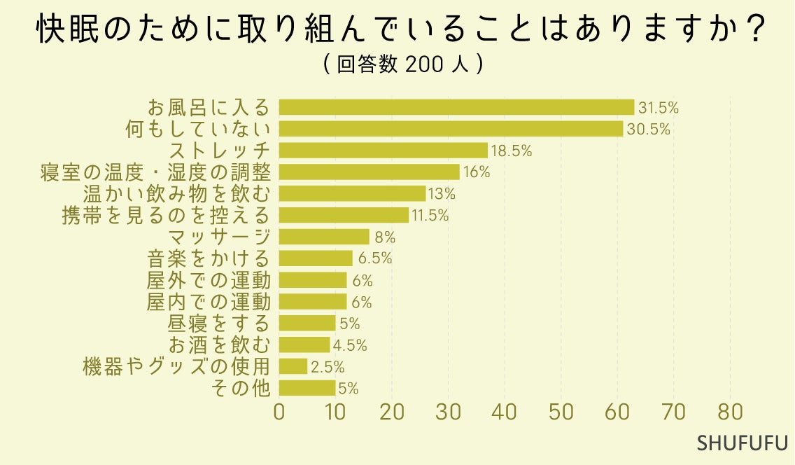 快眠のために取り組んでいることでは「お風呂に入る」が最多でした。あまり熱めのお風呂は睡眠には良くないようなので注意が必要です。