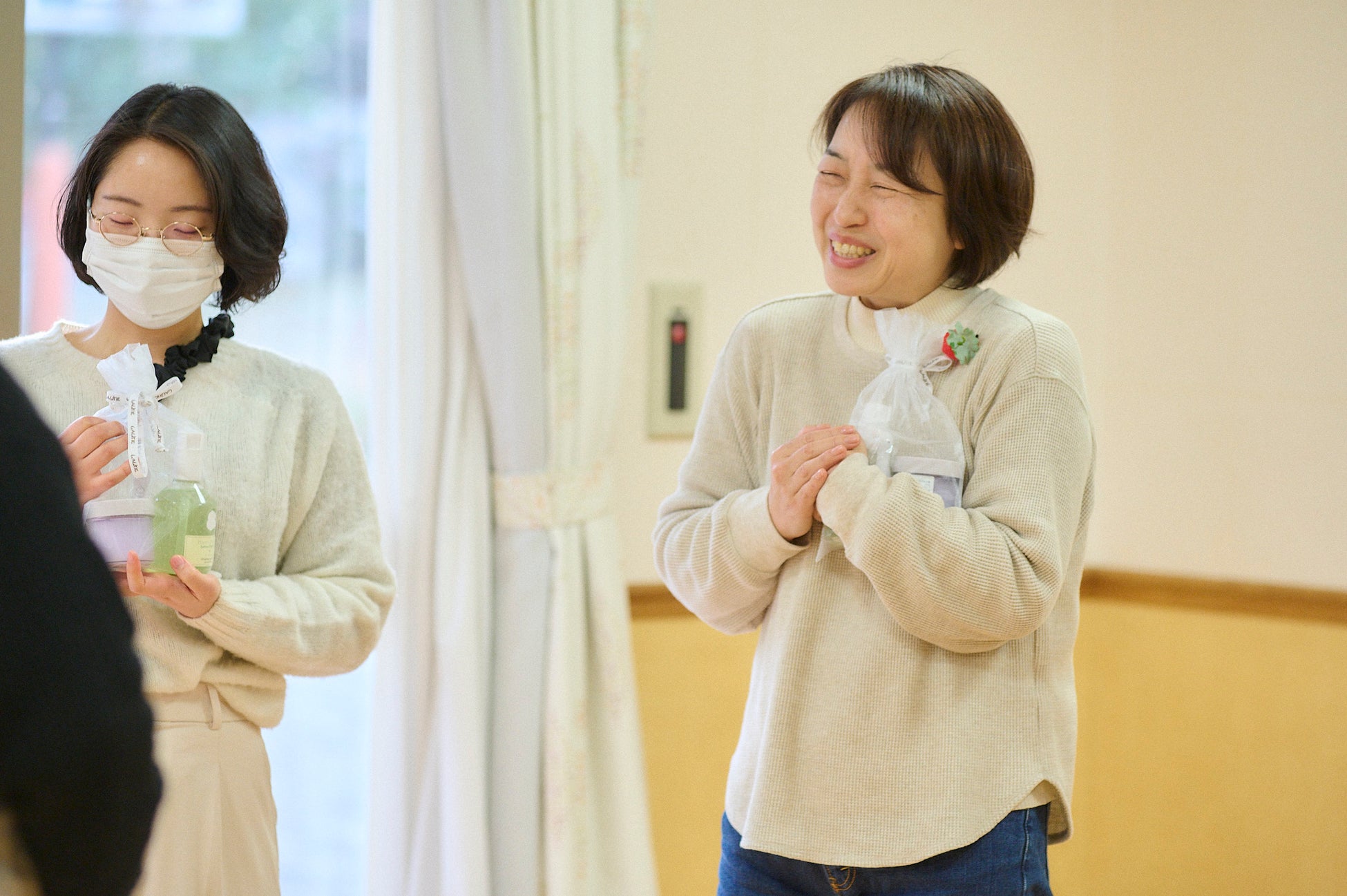当日は、春の陽射しが差し込む集会室に集まった施設職員、お一人おひとりに席についていただき、ハンドクレンジングから「ラリン」が展開するホワイトチェリーブロッサムのスクラブで手の角質を取り、ハンドクリームで手の甲と手のひらをゆっくりとマッサージし、日頃、ハードワークが続く職員の皆様の労を癒す支援を行いました。