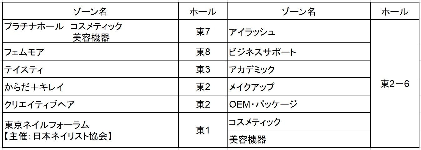 会場は製品カテゴリーごとに分けた14のゾーンで構成されます。昨年、新設された「テイスティ」と「フェムモア」は来場者の注目度を反映してスペースを拡大し、さらに内容を充実します。「テイスティ」には食べる楽しみときれいになりたい希望を満たす美容食品が、「フェムモア」には世界的な広がりを見せるフェムケア・フェムテックの最新トレンドが集結します。落ち着いて商談ができるVIPラウンジやカフェが設置されている特別エリア「プラチナホール」には、品質にこだわったハイエンドコスメや美顔器・美容機器の最新情報のほか、韓国と中国のパビリオンが自国で人気を集めている製品を紹介します。ネイル産業をリードする、NPO法人日本ネイリスト協会主催の「東京ネイルフォーラム2024」は東1ホールで開催します。