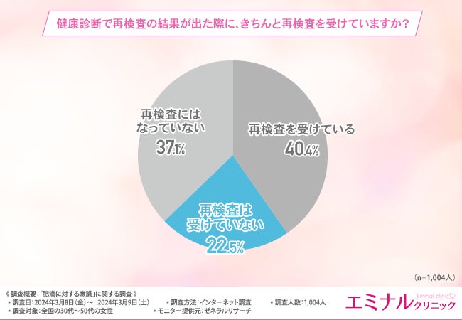 「健康診断で再検査の結果が出た際に、きちんと再検査を受けていますか?」と質問したところ、『再検査を受けている(40.4%)』『再検査は受けていない(22.5%)』『再検査にはなっていない(37.1%)』という回答結果になりました。