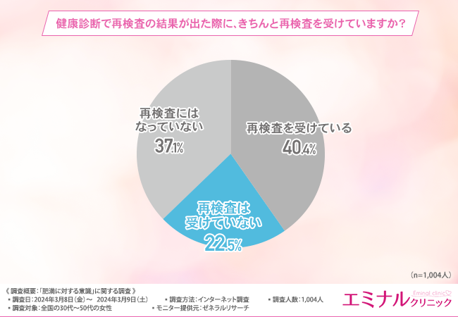 「健康診断で再検査の結果が出た際に、きちんと再検査を受けていますか?」と質問したところ、『再検査を受けている(40.4%)』『再検査は受けていない(22.5%)』『再検査にはなっていない(37.1%)』という回答結果になりました。