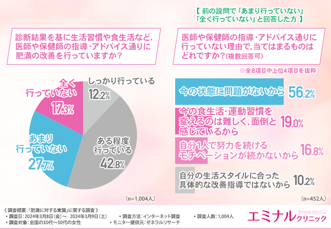 次に、「診断結果を基に生活習慣や食生活など、医師や保健師の指導・アドバイス通りに肥満の改善を行っていますか?」と質問したところ、『しっかり行っている(12.2%)』『ある程度行っている(42.8%)』『あまり行っていない(27.7%)』『全く行っていない(17.3%)』という回答結果になりました。