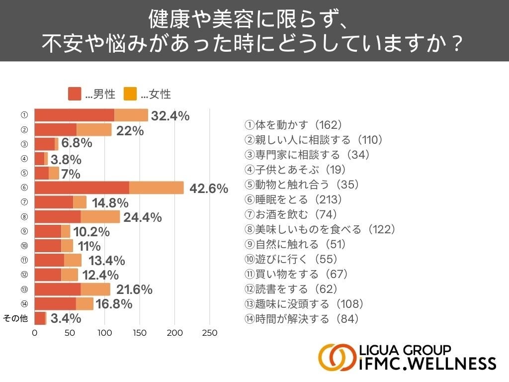 実際に、不安や悩みといったストレスを感じたときには、全体の32%の人がからだを動かすことで、21%の人が趣味に没頭することで、それらを解消していることが分かりました。