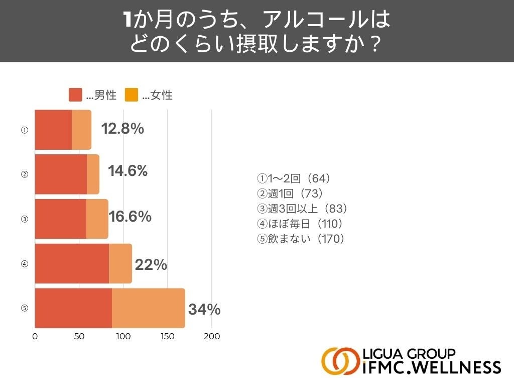 1ヶ月のうち、毎日アルコールを摂取する人は全体の22%、逆に全く飲まない人は34%でした。