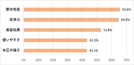 求める効果については、「節水性能」「洗浄力」「美容効果」の3つの要素をあげる人が多く、商品選びの際に特に重要な要素となっていますが、使いやすさ、水圧の強さも一定の関心がある結果に。これらのニーズをいかに満たすかが、ユーザーの支持を集めるポイントと言えそうです。