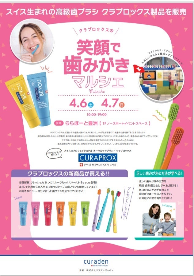 世界90カ国で支持されているスイス発の高機能歯ブラシCuraprox (クラプロックス)を販売する株式会社クラデンジャパン(東京都台東区小島2-6-11 代表取締役:池亀 友)は、2024年4月6日(土)~7日(日)までの2日間限定のポップアップストアをららぽーと豊洲1階ノースポートイベントスペースで開催いたします。