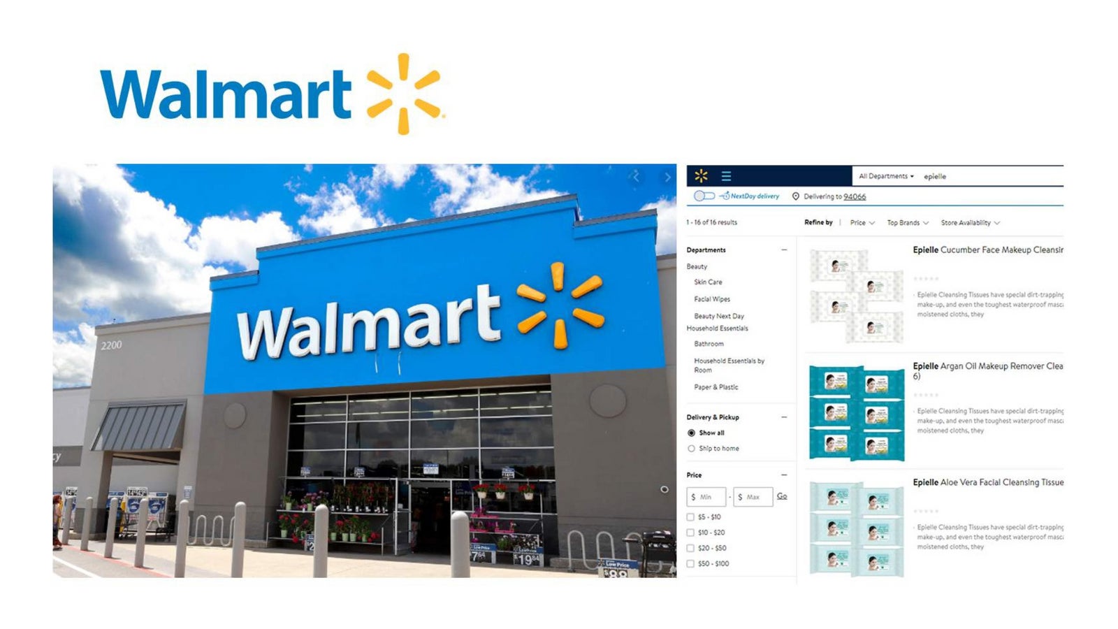 ウォルマートはアメリカ最大のディスカウントストアチェーンで、アメリカ全土に5,362の店舗を持ち、食品、化粧品、雑貨など様々なカテゴリーの商品を販売しています。グローバル市場で世界中の商品と競争しており、epielleブランドはステディセラーとしての地位を確立しています。