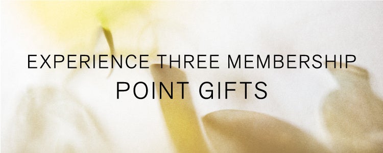 貯まったポイント数に応じて交換できる、日常にひとさじの彩りを添える花器やプレートなどのガラス作家によるオリジナル作品や、精油の芳香で心地よい時間を過ごすためのキャンドルやアロマキットなど、THREEの世界観をご体験いただけるさまざまなギフトをご用意しています。メンバー様限定の特別なプログラムを、ぜひお楽しみください。
