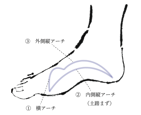 足裏は凹凸(アーチ)があり、そのアーチ機能によって体重を分散し、バネ機能、筋肉の保護の役割をしています。