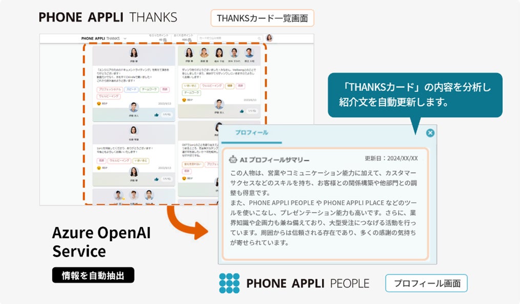 さらに、従業員同士が贈り合ったTHANKSカードの情報をもとに、Azure OpenAI Serviceを活用して「従業員の潜在スキル」を分析し、その結果は『PHONE APPLI PEOPLE』のマイプロフィールに自動的に表示されます。この「AIプロフィールサマリー機能」を活用することで、リアルタイムな人的資本の把握が可能となります。