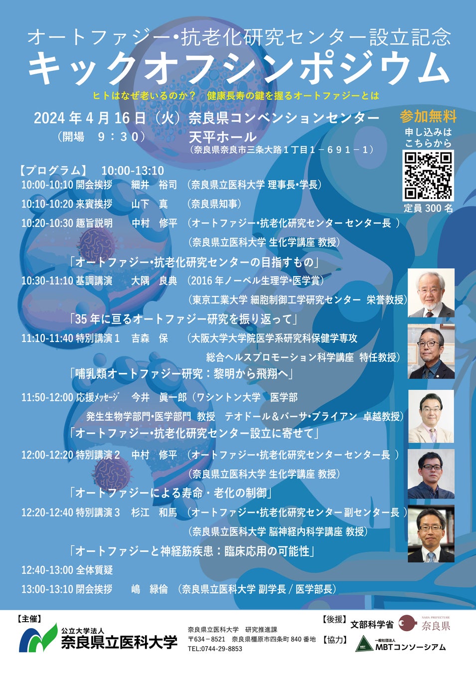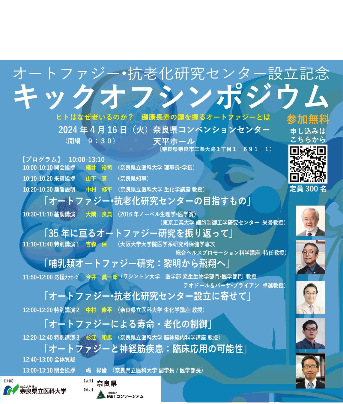 奈良県立医科大学では、オートファジーによる抗老化の研究に重点を置いて研究を促進させるため、2024年4月1日に「オートファジー・抗老化研究センター」を学内に設立いたしました。今回はそのお披露目の意味で下記の日程と場所にて、センターの設立記念キックオフシンポジウムを開催します。