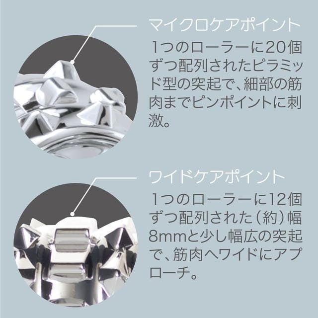 1つのローラーに20個ずつ配列されたピラミッド型のピンポイント突起で、細部の筋肉までしっかりとアプローチします♪