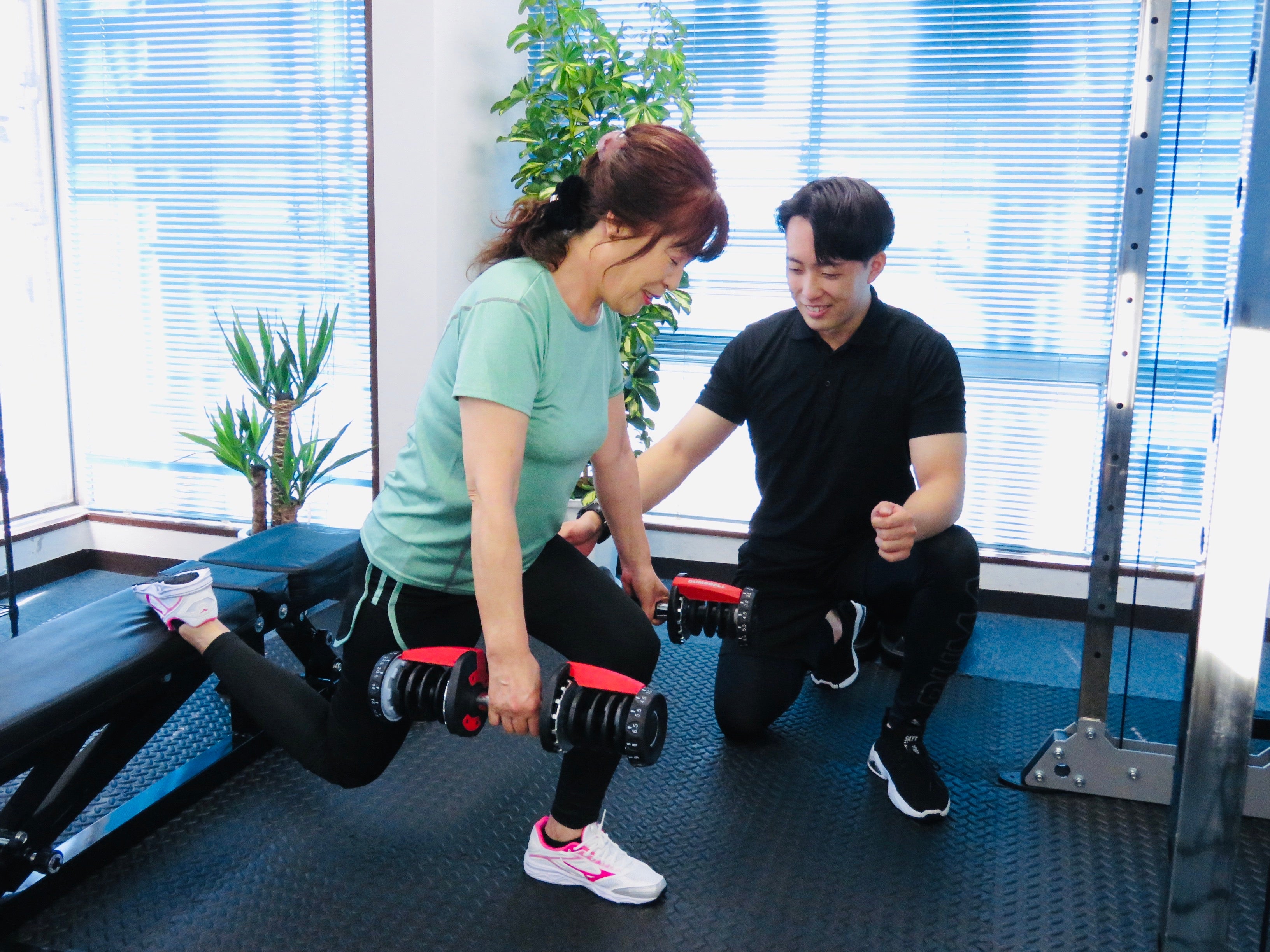 トレーニング前の整体で可動域も広がり、横でフォームを見ながら励ましてもらえることで、自分1人では到底無理と思うようなメニューも頑張れます。おかげで徐々に体力がついているのが実感でき、体重計にもちゃんと反映されるので、食事や日々の生活習慣にも気をつけるようになりました。