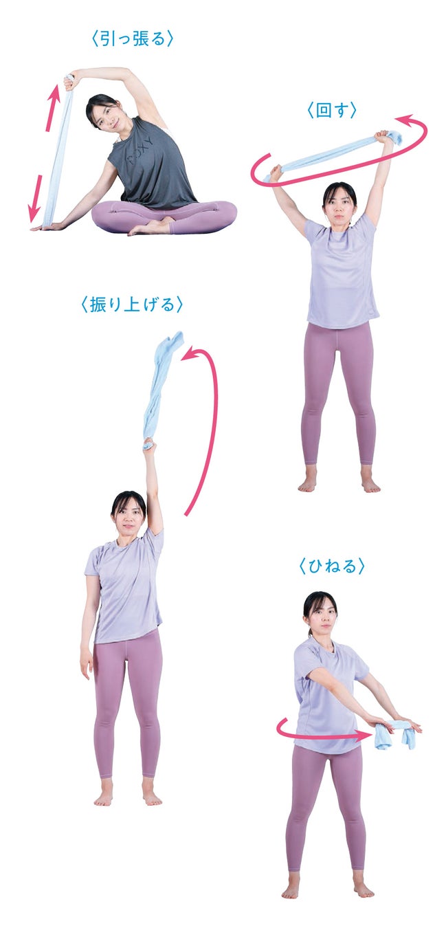 タオルは広げたり畳んだりできる柔らかさと、ある程度強く引っ張っても破れないという強度が両立しています。この特性を生かして、いろいろな使い方ができます。本書で紹介しているのは、「引っ張る」「回す」「振り上げる」「ひねる」などの動きです。ストレッチを行う部位によって、タオルの使い方を変えていきます。