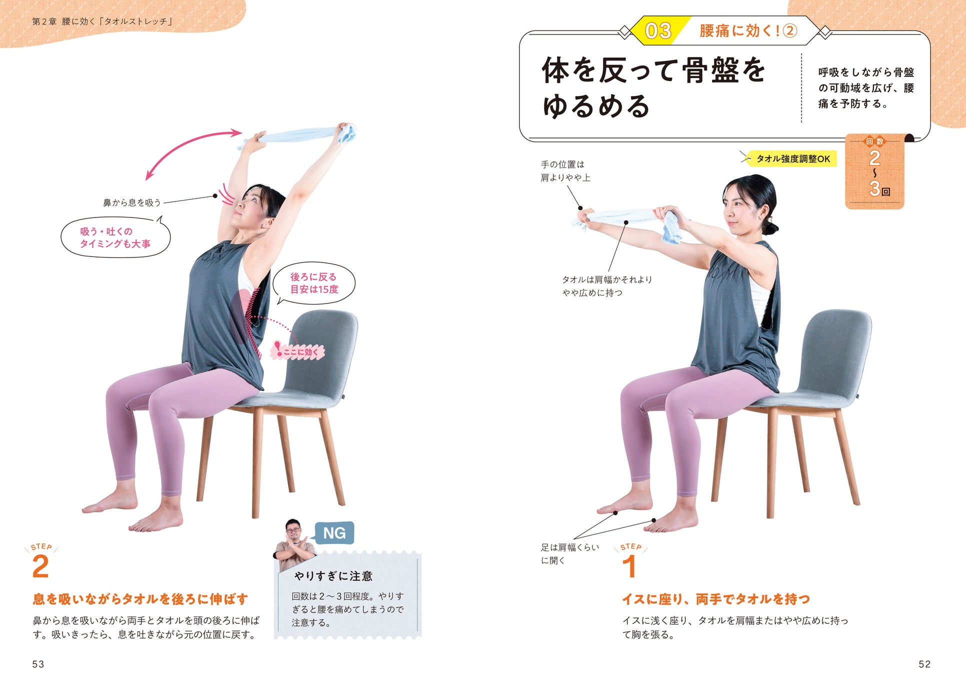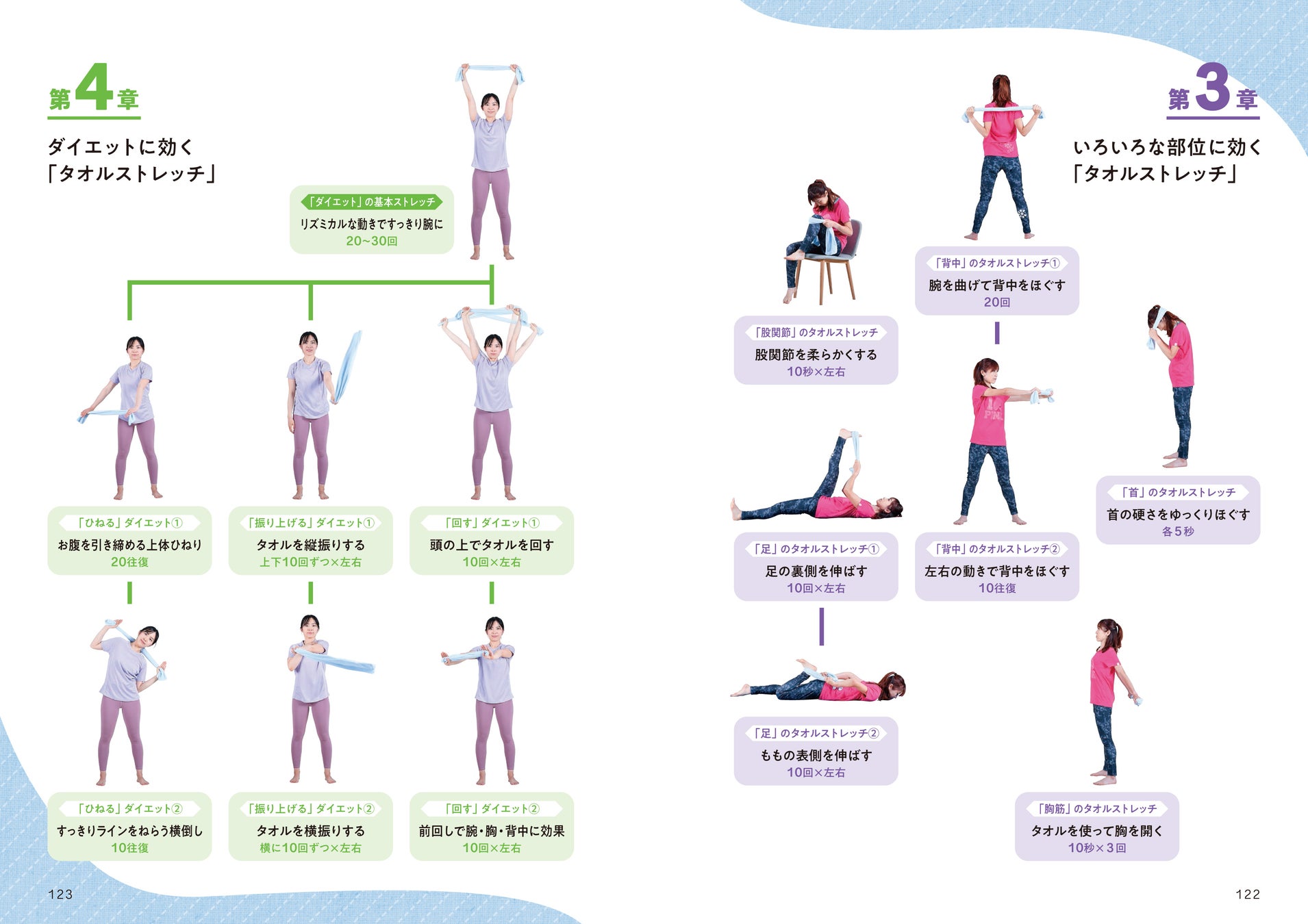 第2章と第3章の最後に、寝る前に行いたいタオルストレッチを各3つ紹介しています。血流を良くして、リンパを刺激し、リラックスした状態になれます。