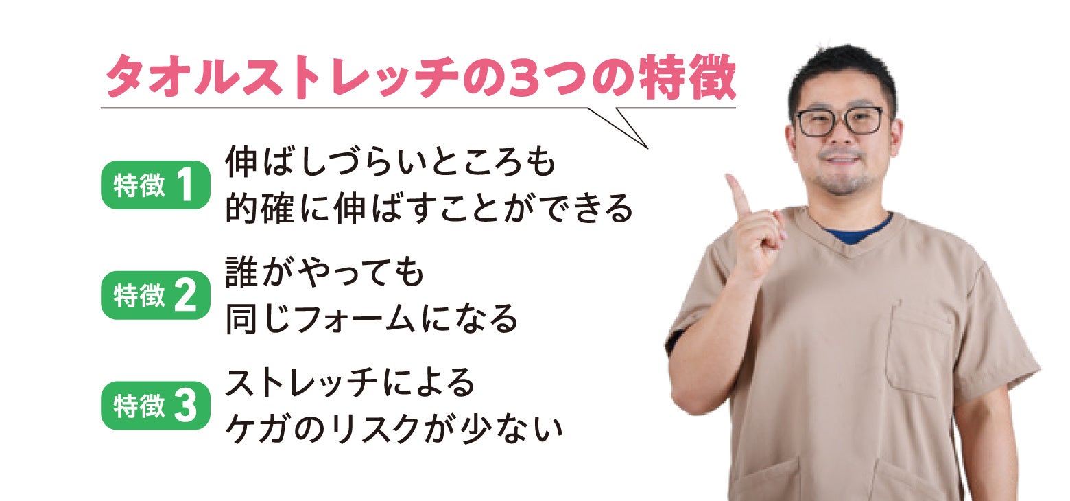 どの家庭にもある普通のタオルを使い、体が硬い方や運動が苦手な方でもしっかりと体を伸ばすことができます。伸ばしたいところをしっかり伸ばせるので、効果も出やすい。効果が出るから、続けたくなる。そんないいサイクルが生み出せるストレッチです。